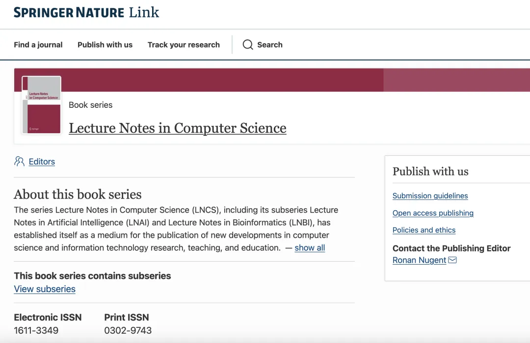 其中LNCS是Springer出版的计算机科学系列会议录,包括LNAI(Lecture Notes in Artificial Intelligence)、LNBI(Lecture Notes in Bioinformatics)等子系列,涵盖人工智能、数据库、网络等方向的最新研究。