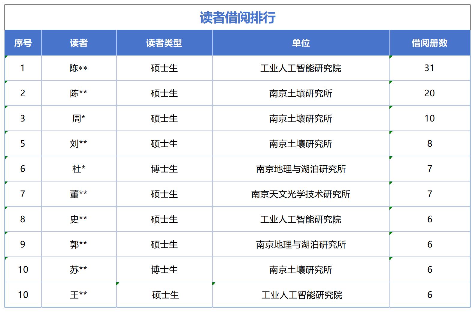 现在,让我们一起来看看活动期间个人借阅量排名前十的同学以及他们的阅读书单吧!