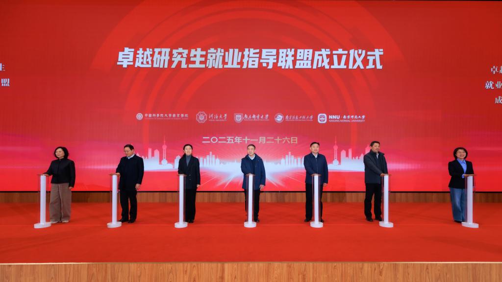 11月26日上午,卓越研究生就业指导联盟成立仪式暨2026届硕士博士毕业生专场招聘会在中国科学院大学南京学院(简称“国科大南京学院”)举行。国科大南京学院院长杨桂山,河海大学党委副书记、副校长陆国宾,南京邮电大学党委常委、副校长谢平,南京信息工程大学党委常委、副校长金自康,南京师范大学副校长袁林旺,南京市人力资源和社会保障局副局长丁雪,南京市麒麟科创园管委会副主任俞清出席仪式,相关高校职能部门负责人参加仪式。仪式由国科大南京学院副院长、南京土壤研究所副所长颜晓元主持。